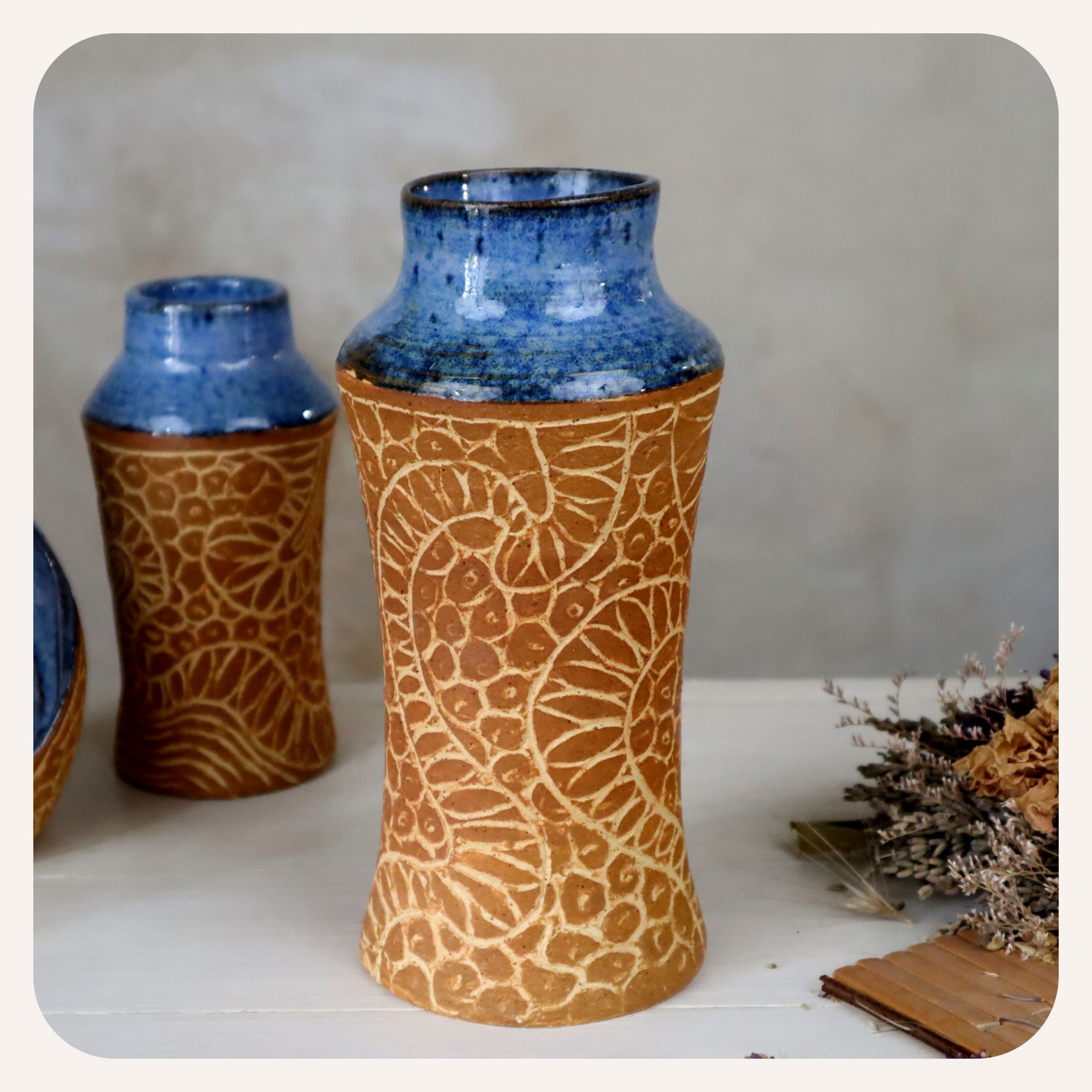 Inspiré par les profondeurs de l’océan, il arbore un bleu intense rehaussé d’arabesques gravées d’une touche d’ocre. Je tourne et je grave chaque gobelet. Chaque cuisson ajoute sa touche personnelle. Ainsi chaque pièce est unique par sa forme, sa couleur et sa texture, et reflète ainsi la richesse de l’artisanat.