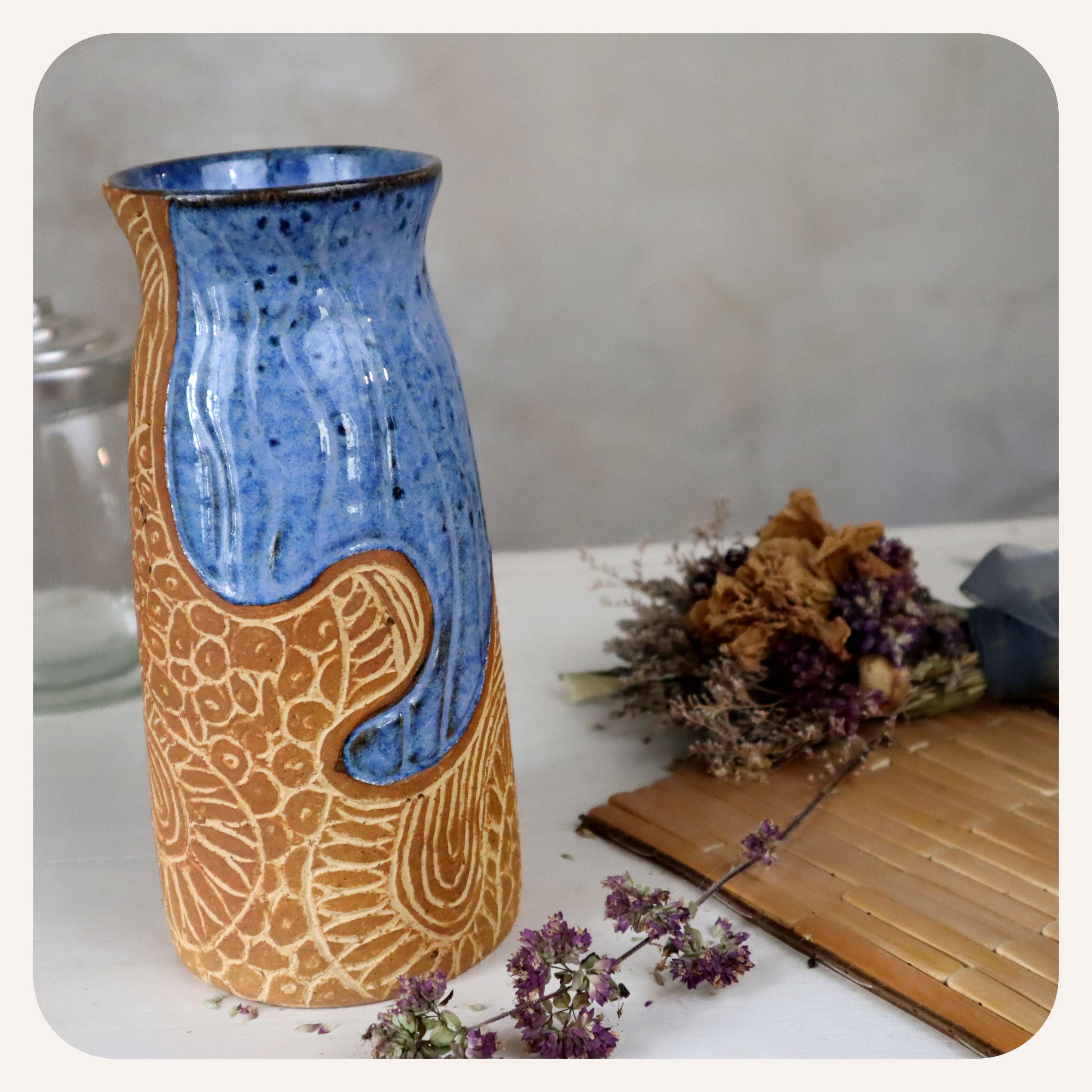 Fabriqué dans mon atelier à Montaigu de Quercy, dans le sud-ouest de la France, chaque pièce prend vie sur le tour de potier, recouverte d’engobe ocre puis gravée. La gravure laisse réapparaître la couleur de la terre, un mélange de grès issus de différentes régions. Après une première cuisson, je plonge chaque pièce artisanale dans deux bains d’émaux, composés par mes soins à base de minéraux tels que le feldspath, la craie et le kaolin… pour obtenir un bleu océan profond et vibrant.