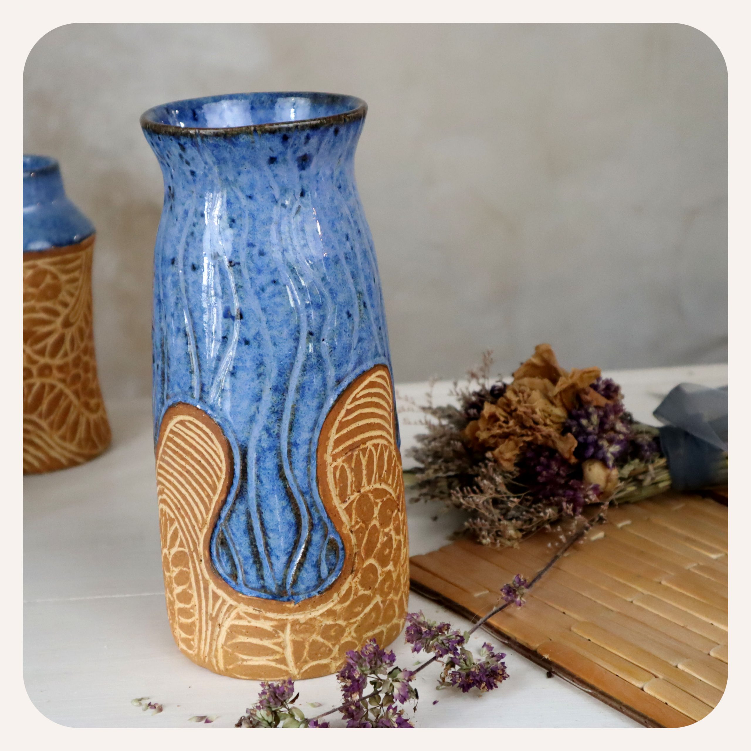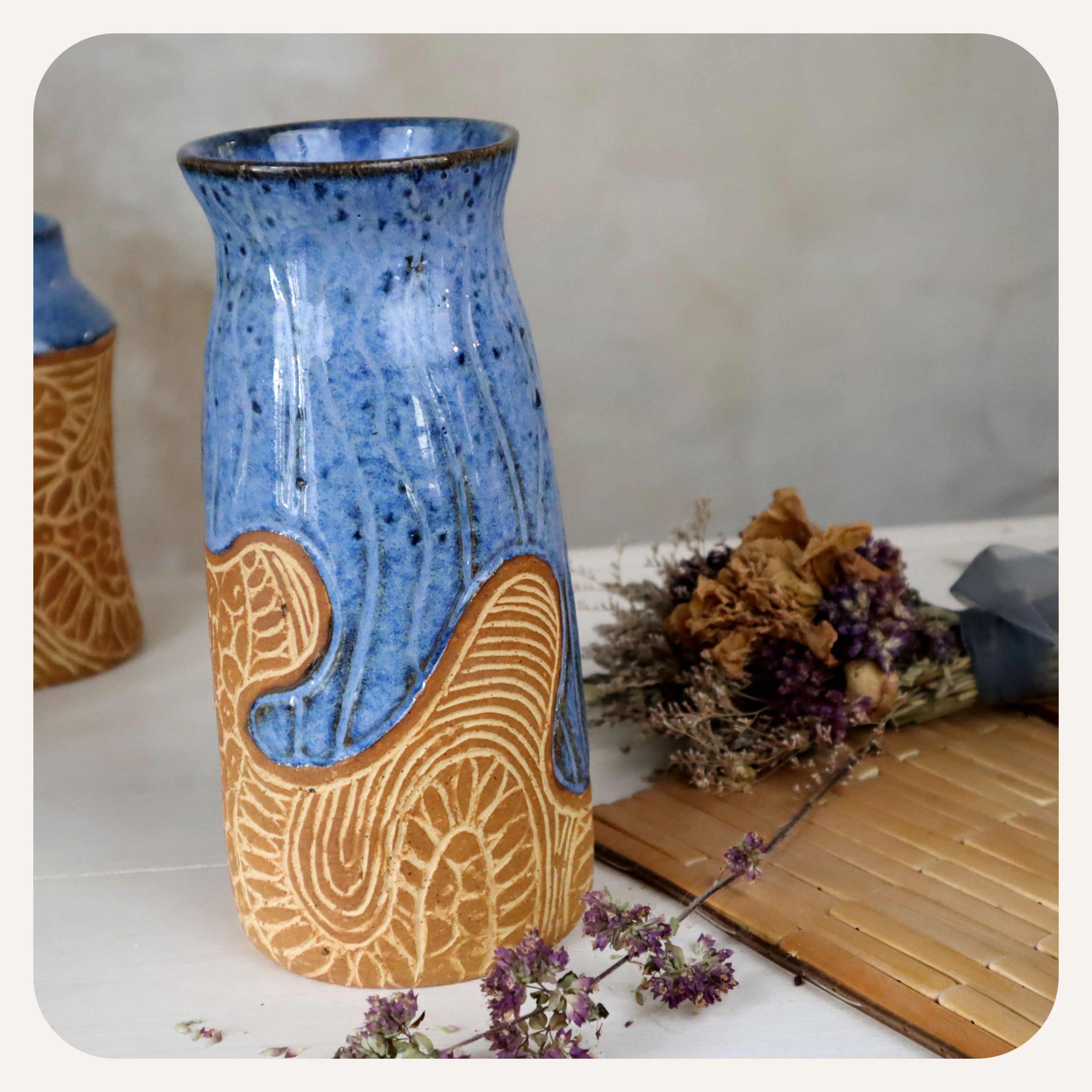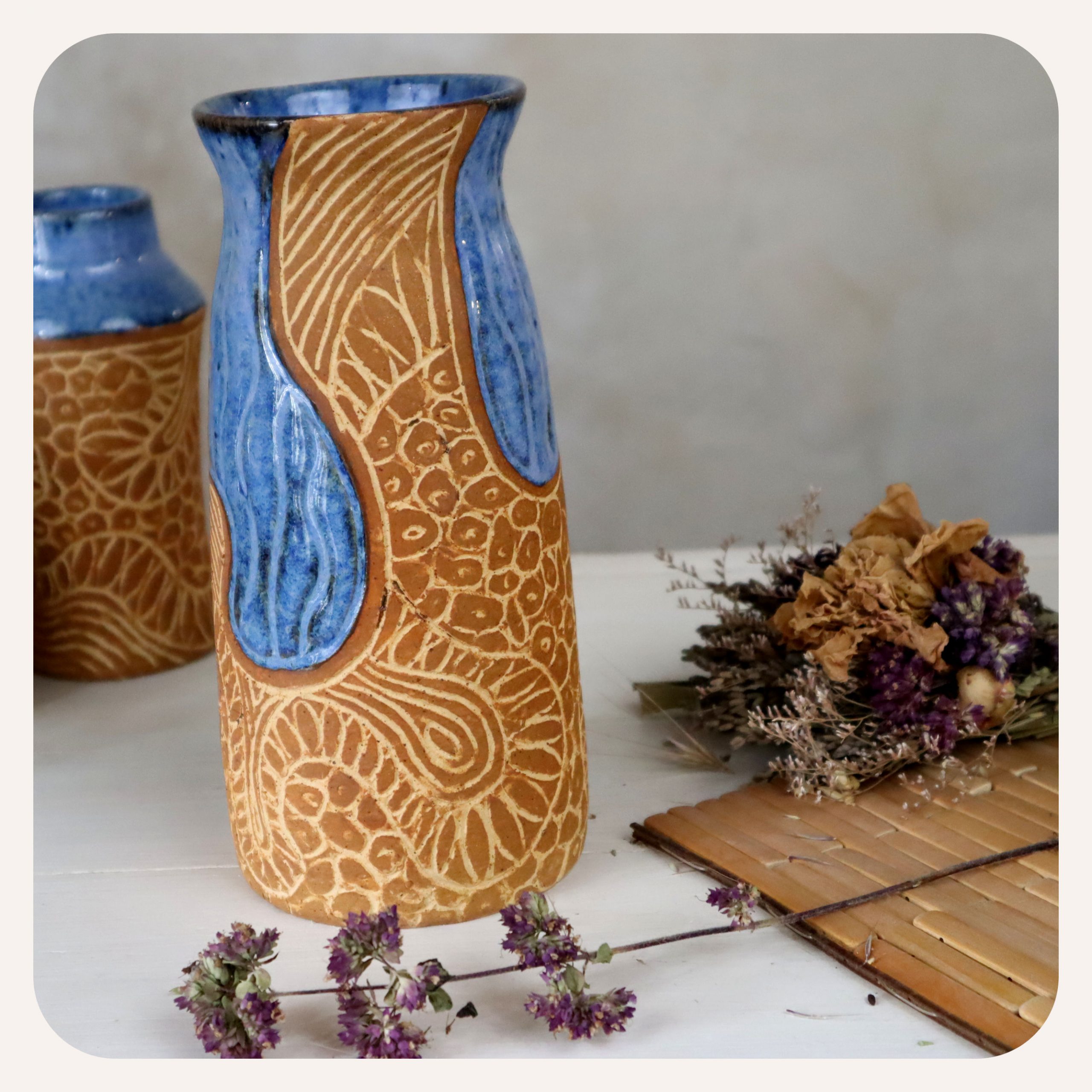 Inspiré par les profondeurs de l’océan, il arbore un bleu intense rehaussé d’arabesques gravées d’une touche d’ocre. Je tourne et je grave chaque gobelet. Chaque cuisson ajoute sa touche personnelle. Ainsi chaque pièce est unique par sa forme, sa couleur et sa texture, et reflète ainsi la richesse de l’artisanat.