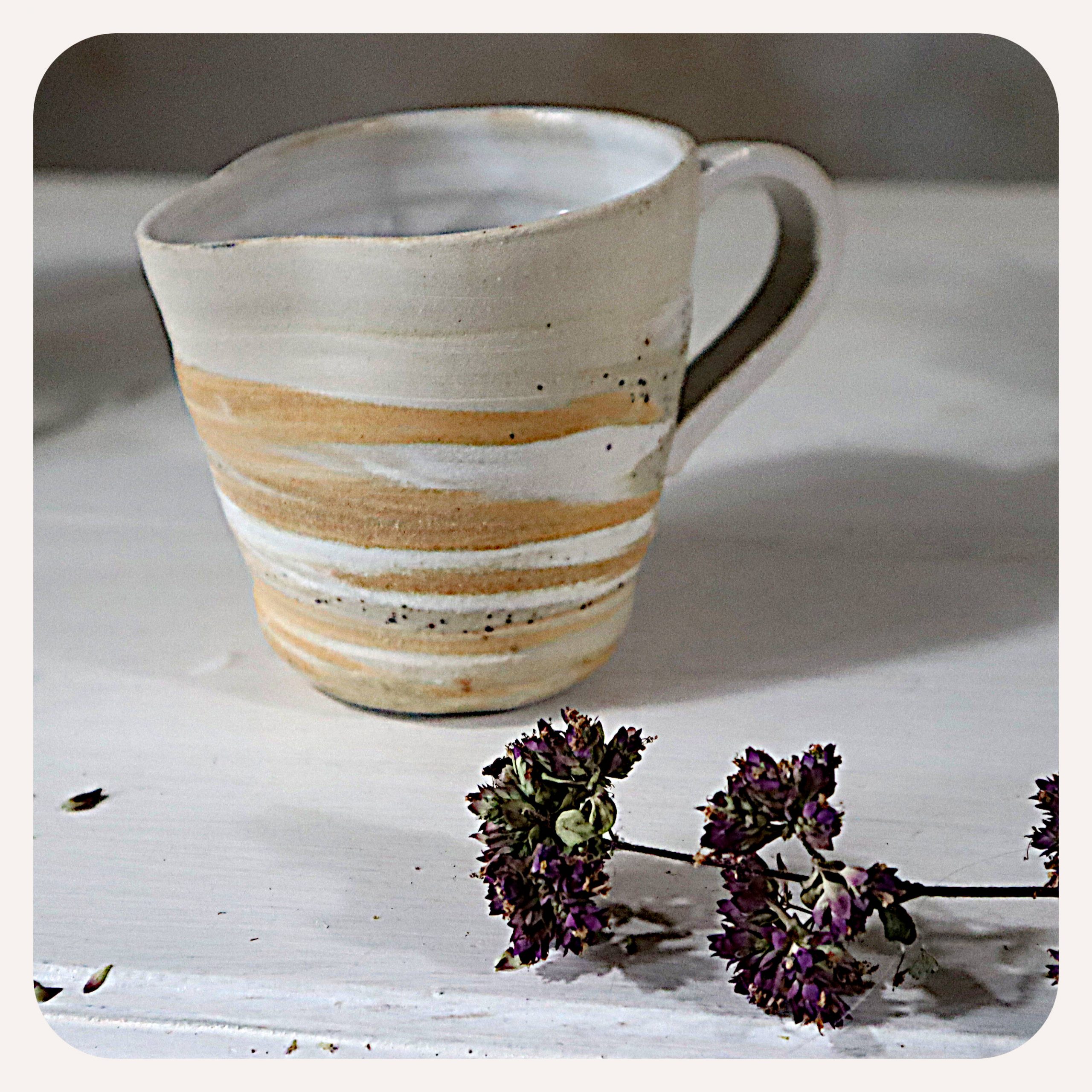 Fabriqué dans mon atelier à Montaigu de Quercy, dans le sud-ouest de la France, chaque pichet prend vie sur le tour de potier. Il est ensuite déformé pour accentuer l’impression de paysage donné par les différentes terres qui apparaissent sur l’extérieur. Après une première cuisson, j’émaille l’intérieur de chaque pichet artisanal avec un émail, composé par mes soins à base de minéraux tels que le feldspath, la craie et le kaolin… pour obtenir un blanc doux.