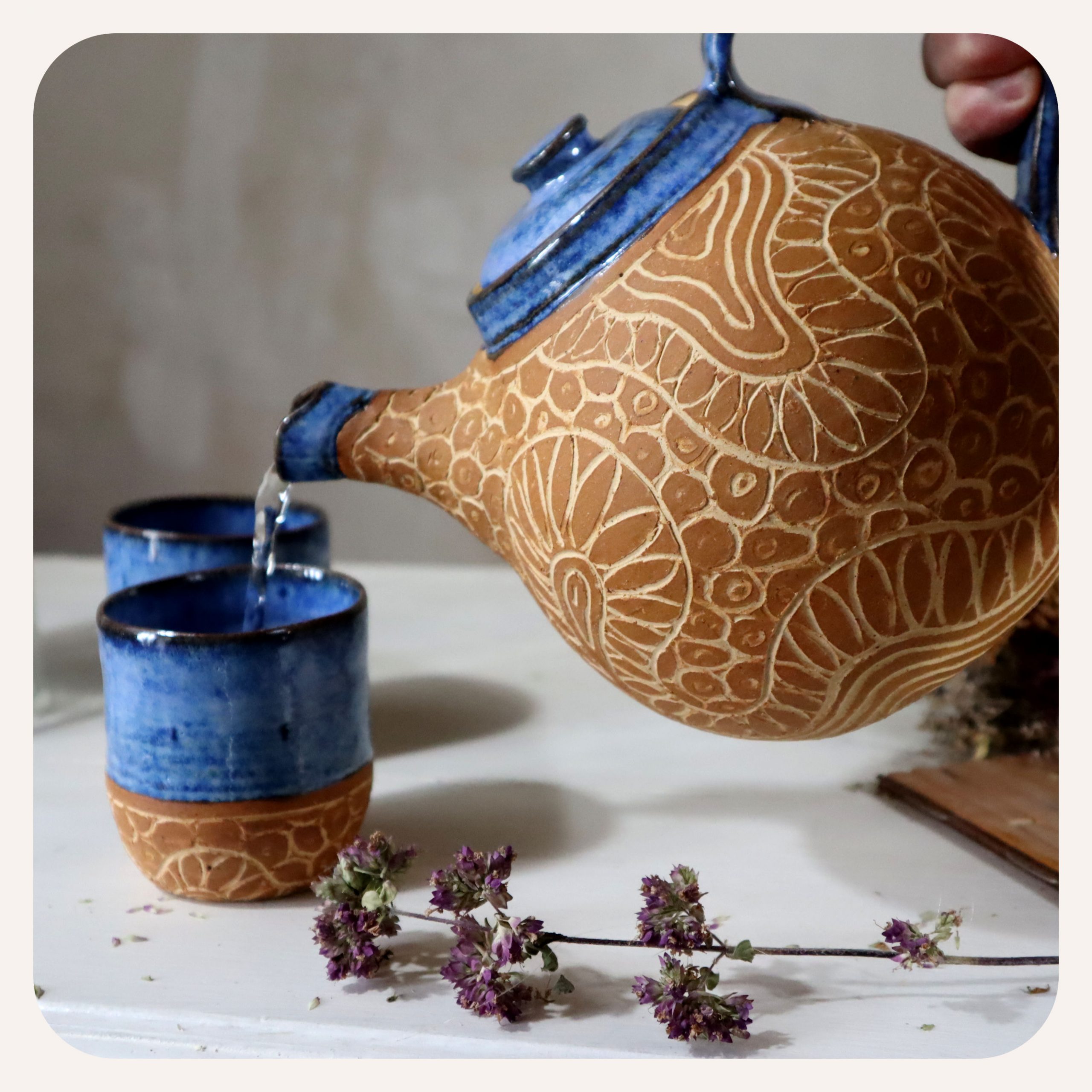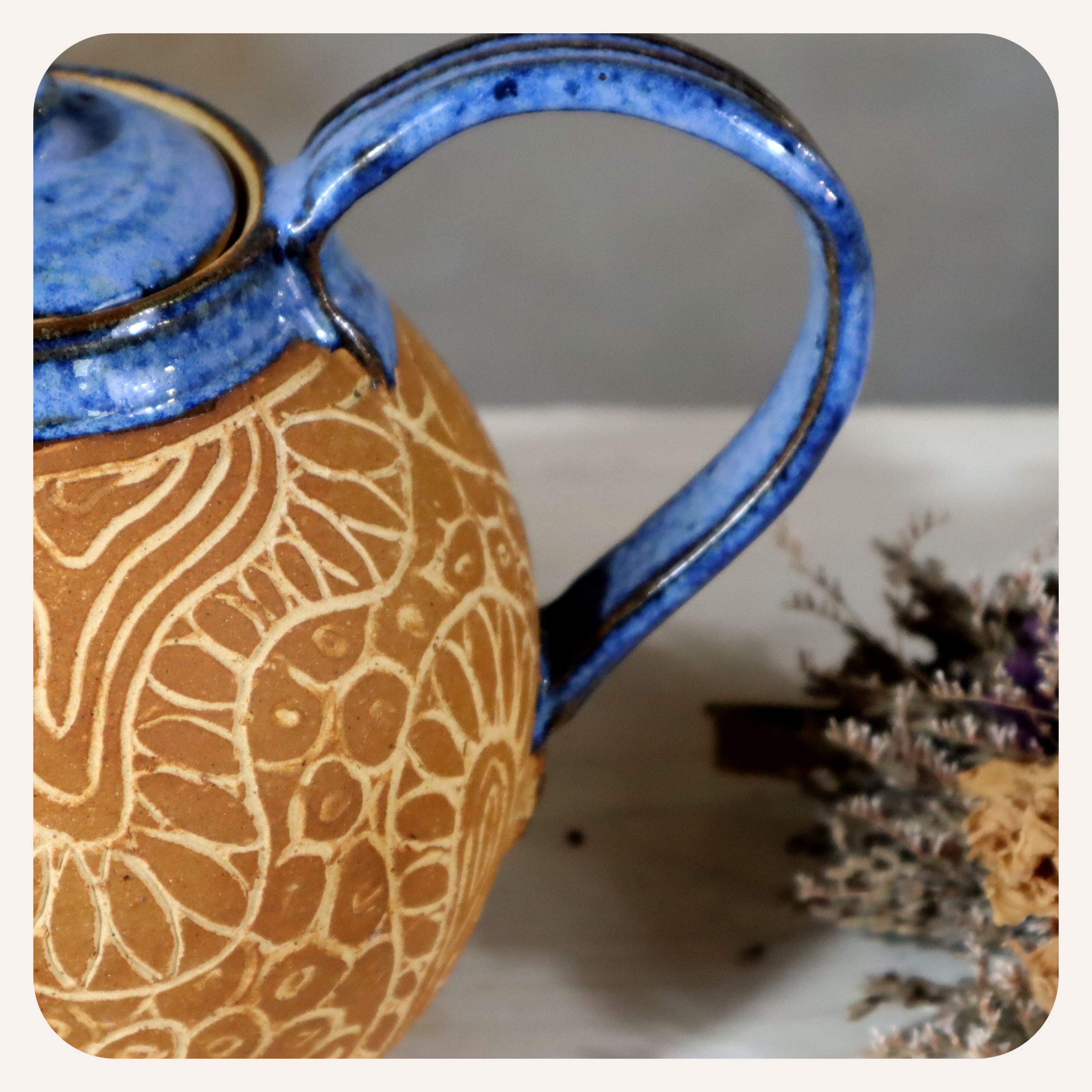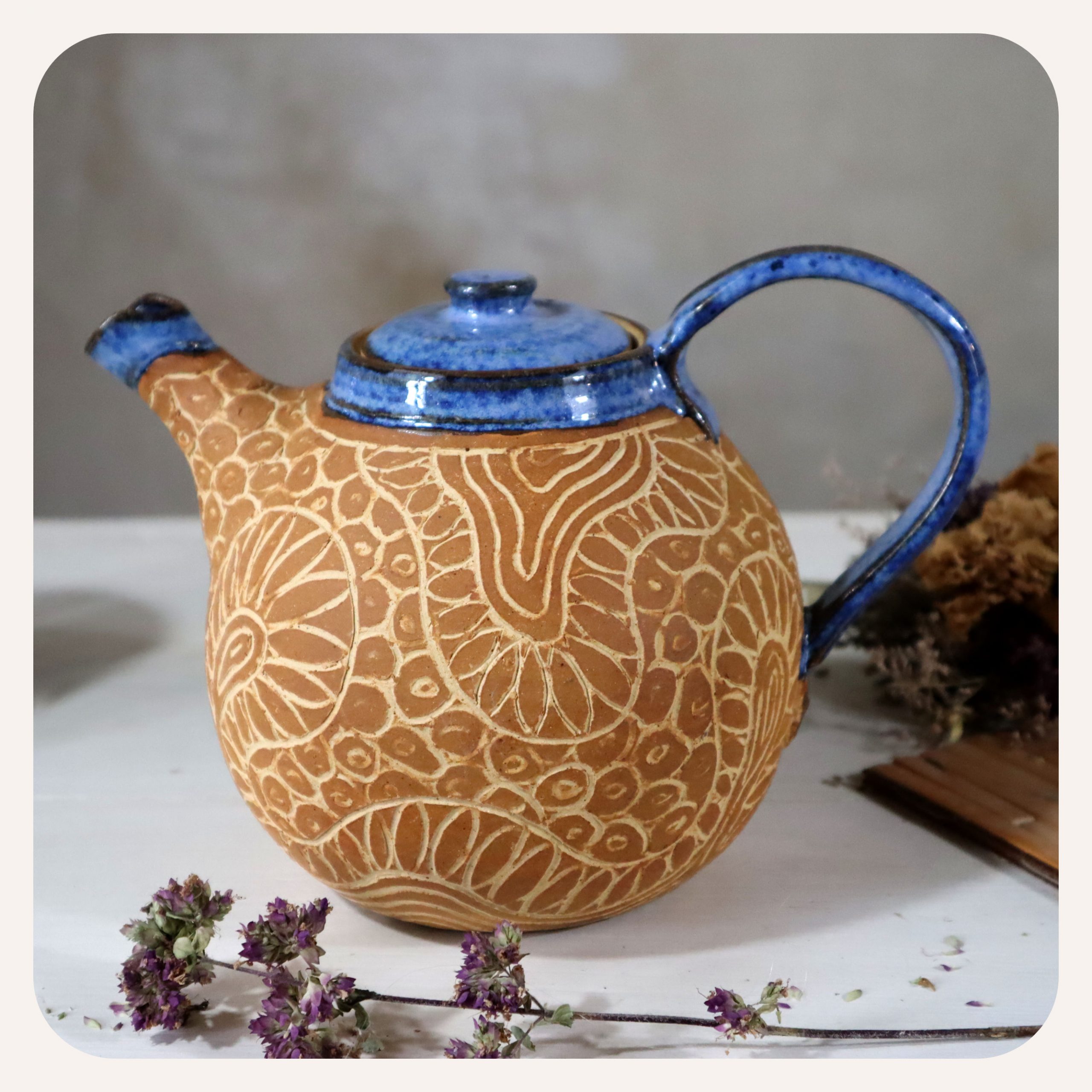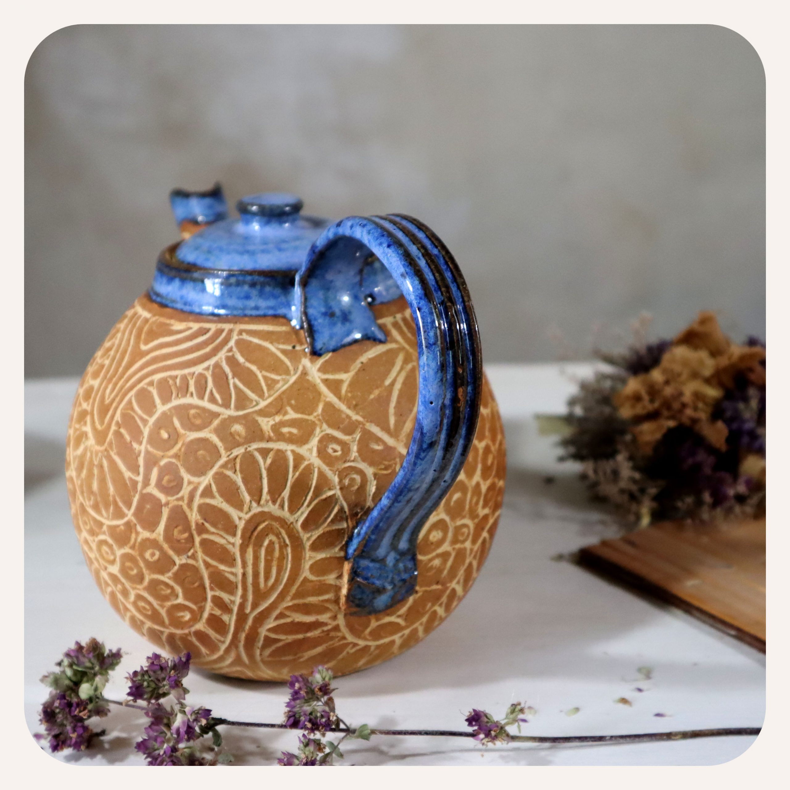 Cette théière grès bleu entièrement gravée contient 1,3 l pour faire infuser et servir du thé ou une infusion et le partager en famille ou entre amis…